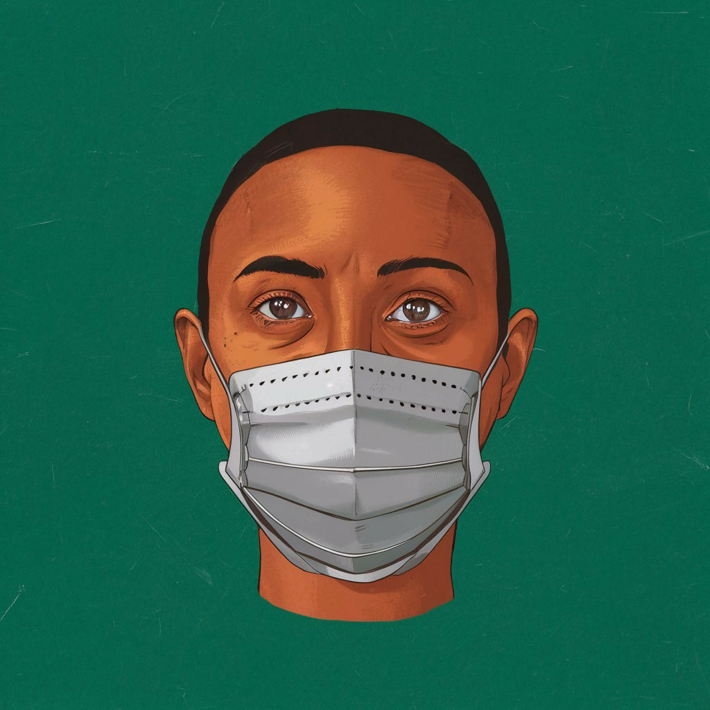 This striking digital illustration captures the determined gaze of a healthcare worker, masked and ready to face any challenge. The artwork emphasizes the resilience and dedication of frontline workers, featuring rich, warm tones and meticulous details that bring the subject's expression to life. Set against a deep green background, this piece conveys a sense of calm strength and unwavering commitment.