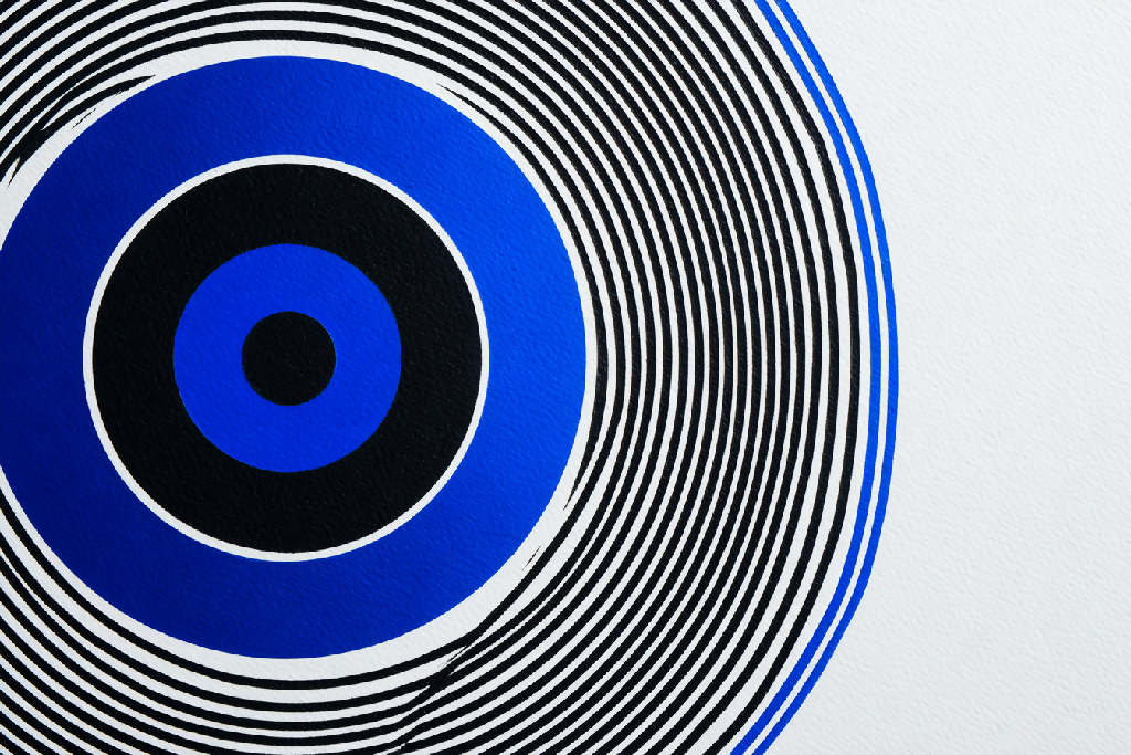 A visual exploration of vibration, rhythm, and repetition through concentric forms. This abstract series blends precise geometry with granular textures that evoke the wear of time and the energy of motion. The dominant blue and black tones suggest depth, frequency, and emotional contrast—each image like a wave expanding through space.