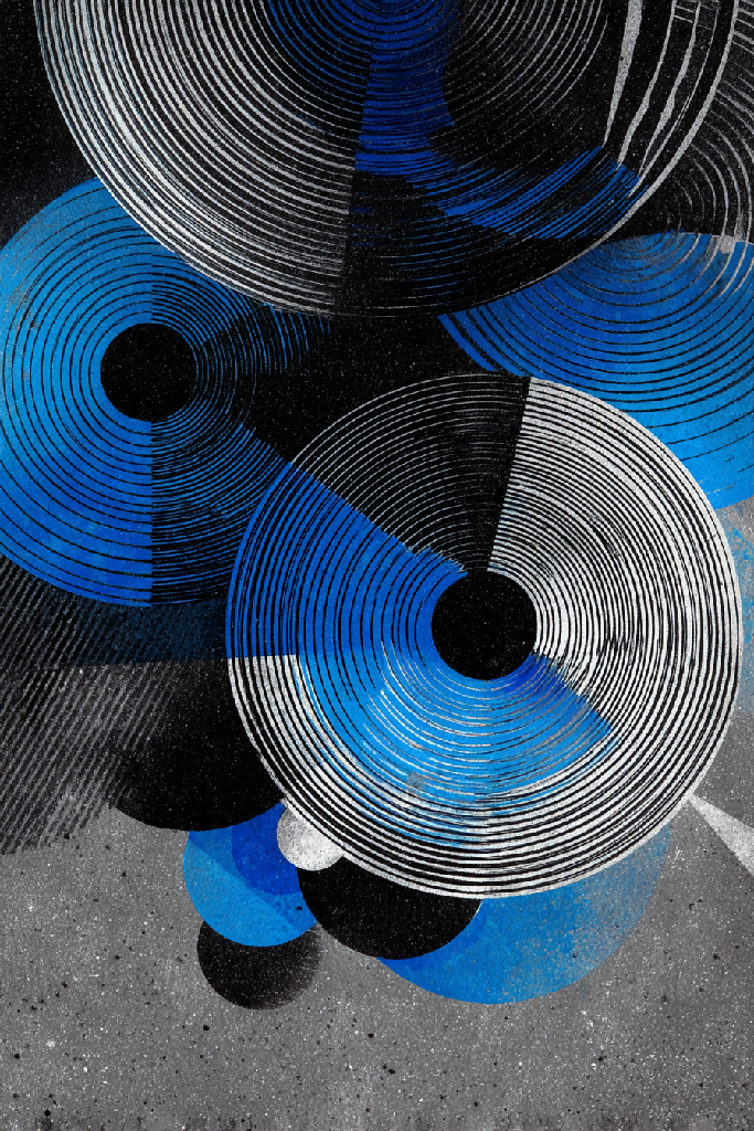 A visual exploration of vibration, rhythm, and repetition through concentric forms. This abstract series blends precise geometry with granular textures that evoke the wear of time and the energy of motion. The dominant blue and black tones suggest depth, frequency, and emotional contrast—each image like a wave expanding through space.