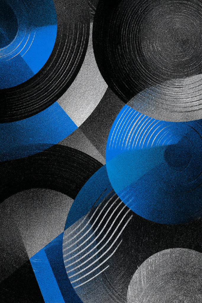 A visual exploration of vibration, rhythm, and repetition through concentric forms. This abstract series blends precise geometry with granular textures that evoke the wear of time and the energy of motion. The dominant blue and black tones suggest depth, frequency, and emotional contrast—each image like a wave expanding through space.
