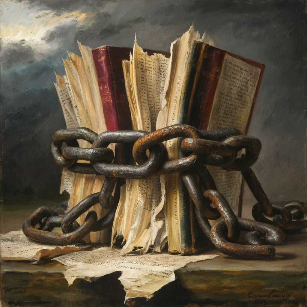 The books, with their pages torn and covers worn, represent knowledge and ideas suppressed by an oppressive force. The chain, a symbol of constraint and control, wraps tightly around the books, emphasizing the weight of the restraint.