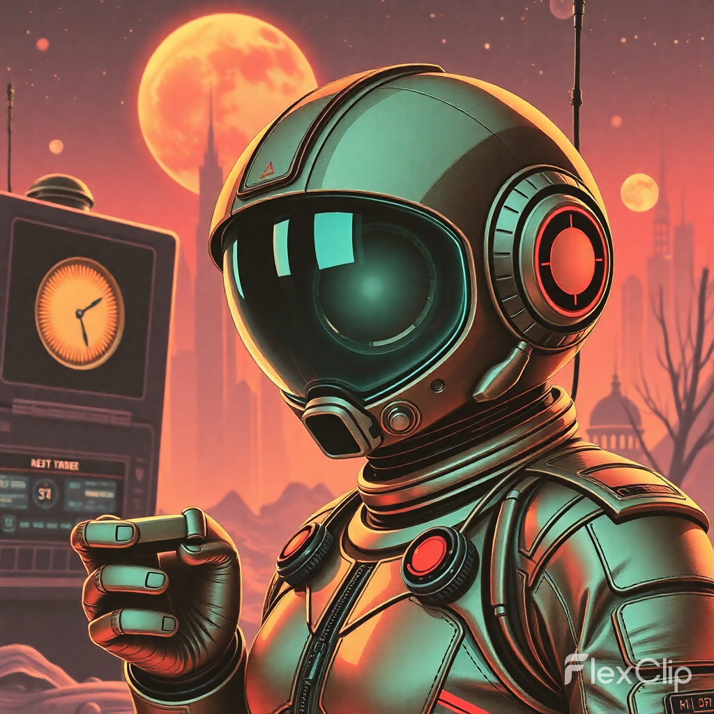 A stylized image of an astronaut in a sleek, vintage-inspired spacesuit. Set against a red-tinged landscape with a massive moon and city skyline, the astronaut appears to be interacting with a retro-style device. The overall aesthetic evokes a sense of classic science fiction art and design.