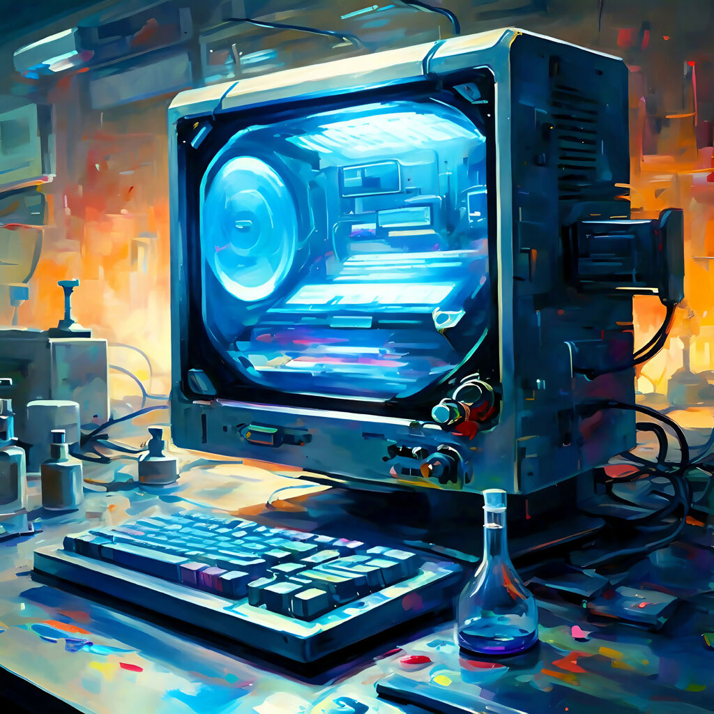 Dive into a world where vintage technology meets futuristic aesthetics with this Retro-Futuristic Lab Computer Art Print. This captivating piece features a glowing blue-lit computer setup reminiscent of early computing days set against a vibrant abstract background. The detailed depiction of laboratory equipment and the intricate design of the computer create a unique blend of nostalgia and innovation making it a perfect addition to any modern or tech-themed space. Ideal for tech enthusiasts gamers and art lovers alike this print brings a touch of the past into the future.