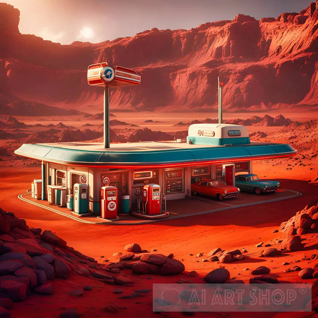 Step into the retro-futuristic allure of a gas station on Mars, a visual paradox blending the nostalgia of the past with the bold vision of the future. In this captivating image, crimson-hued Martian landscapes stretch beyond the horizon, while a meticulously designed retro gas station stands as an unexpected yet oddly fitting sentinel in this extraterrestrial terrain.