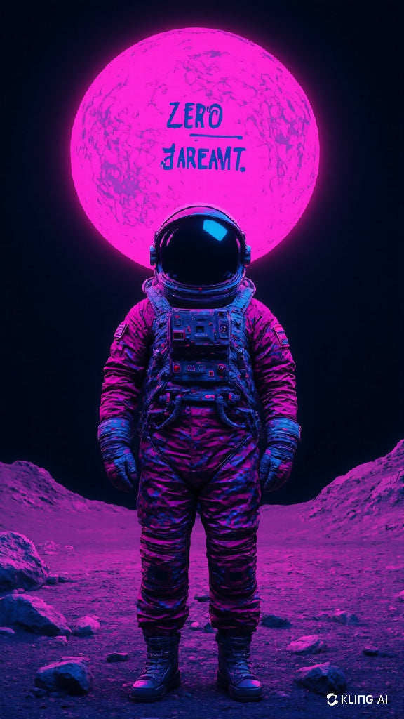 A lone neon moon man drifts through a cosmic dreamscape, his silhouette glowing with electric pinks and deep purples against the endless void of space. His futuristic suit pulses with neon circuitry, tracing celestial patterns across his body as he glides weightlessly past glowing asteroids and vaporwave-colored nebulae. His visor reflects a luminous, digital moon, casting an otherworldly glow on the galactic horizon. With each step, the fabric of space ripples in neon waves, leaving behind a shimmering trail of cosmic energy—an explorer of the unknown, lost in the endless beauty of a neon-lit universe.
