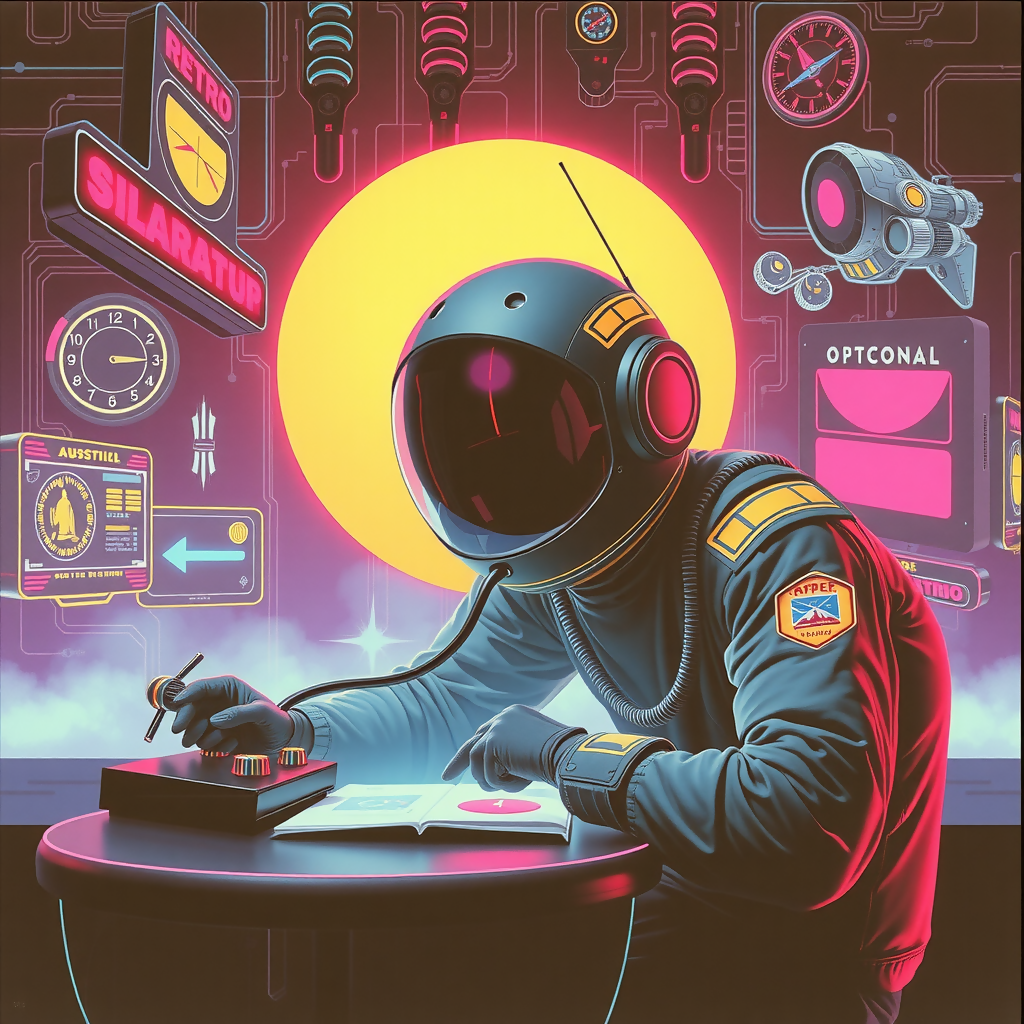 A lone astronaut in a retro-futuristic setting, surrounded by vintage technology, navigates through data while sitting at a table. The vibrant colors and neon signs evoke a nostalgic yet futuristic atmosphere.