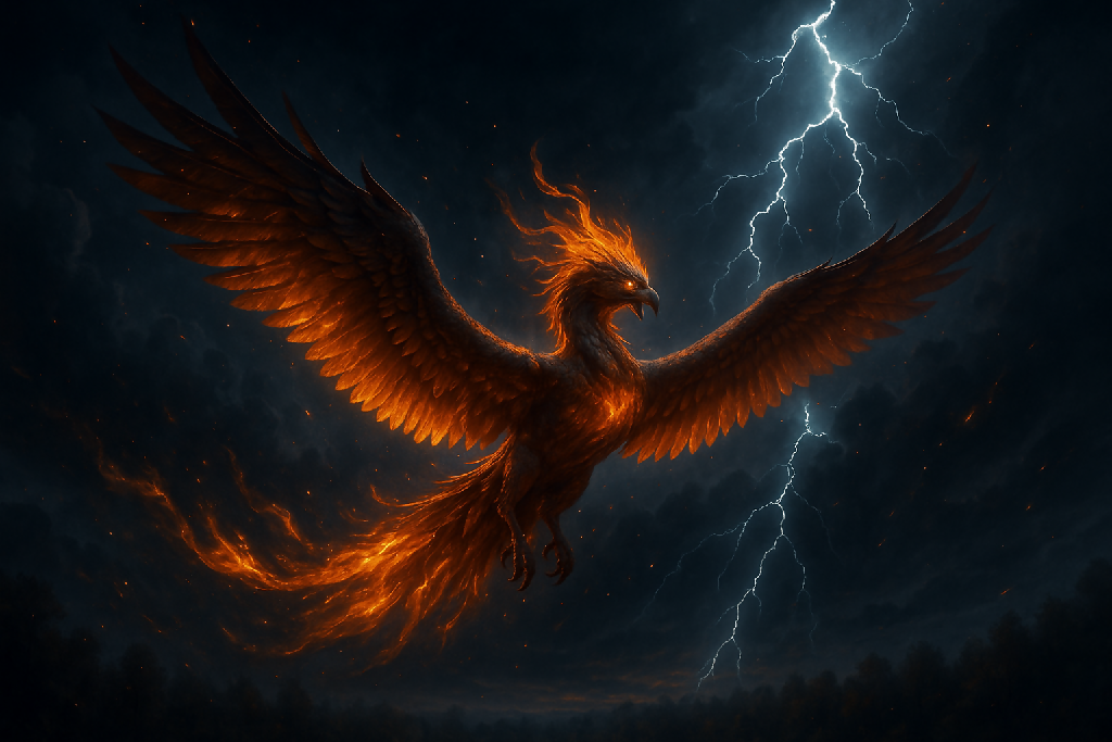 This is not a flight of fear, but a flight of rebirth. The phoenix embodies resilience and transformation, rising from the ashes not in spite of the storm, but because of it. Its fire is not consumed by the darkness—it illuminates it, carving a path of light through chaos.