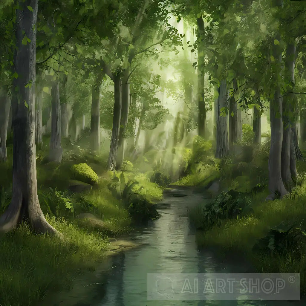 Immerse yourself in the tranquil beauty of nature with this captivating photograph, "River in the Forest." This stunning image captures the serene essence of a meandering river as it flows gracefully through a lush, verdant forest. The scene is a symphony of greens, with towering trees creating a natural canopy, their leaves whispering in the gentle breeze.
