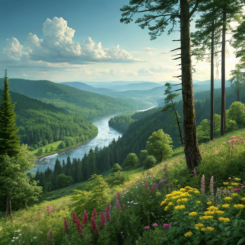 The image depicts a serene river flowing through a lush valley, surrounded by vibrant trees and colourful flowers. The landscape showcases the beauty of nature, with elements such as grass, clouds, and a clear sky complementing the scene. It reflects the tranquillity of a natural wilderness area, likely within a national park or nature reserve.