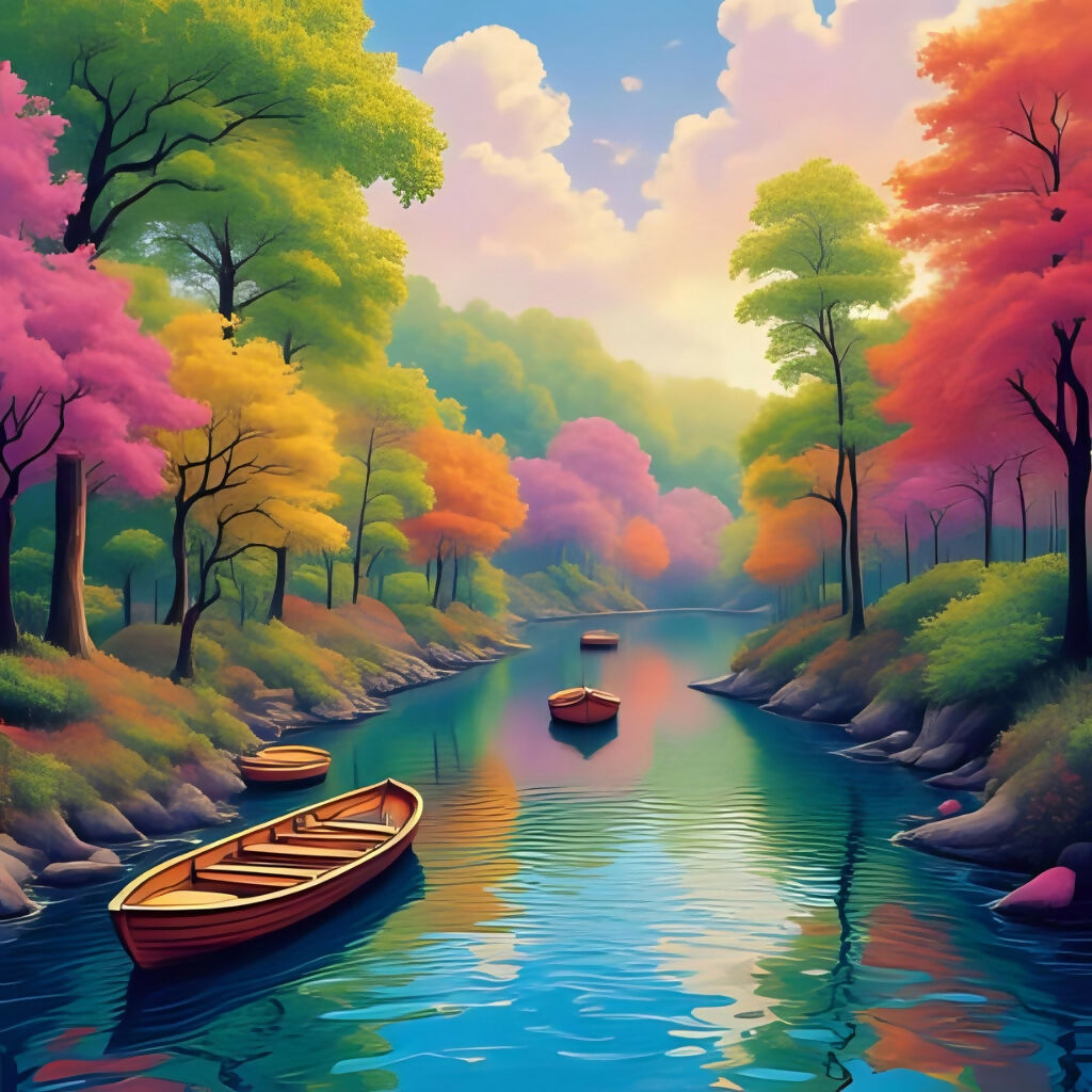 Relax into the gentle atmosphere of this impressionist AI artwork. Soft light, flowering trees, and drifting boats evoke timeless serenity.