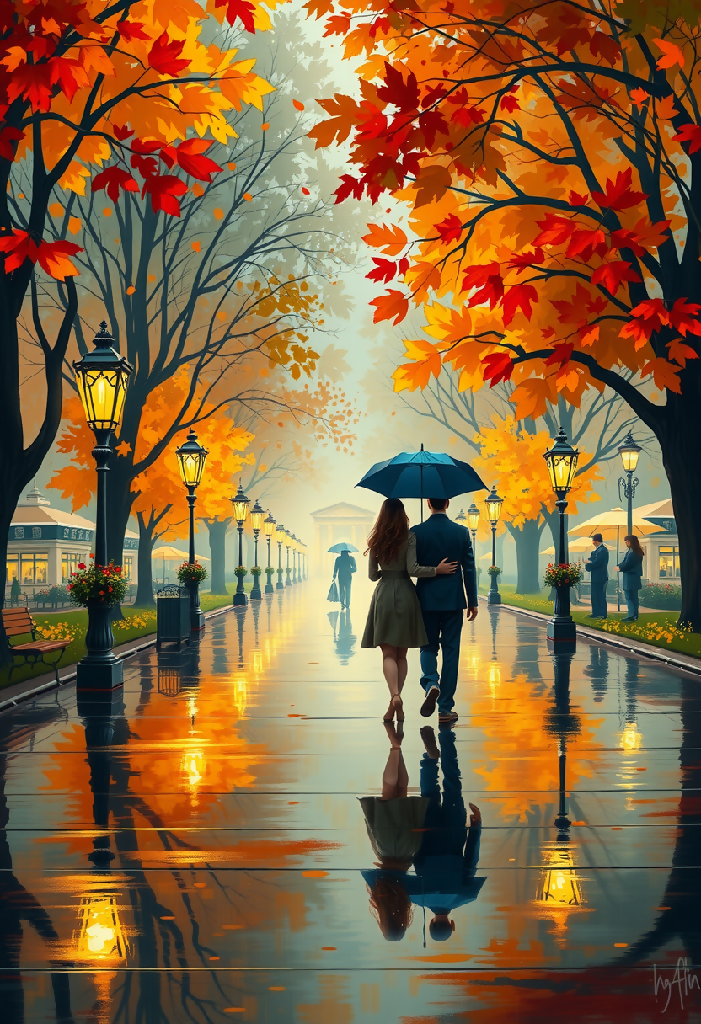 #AutumnVibes #RainyRomance #CoupleGoals #FallColors #RomanticWalk #ArtLovers #DigitalPainting #ScenicLove #AutumnLeaves #CityParkScenes #UmbrellaLove #GoldenHourMood #ReflectionArt #CozyEvenings #MoodyAesthetic