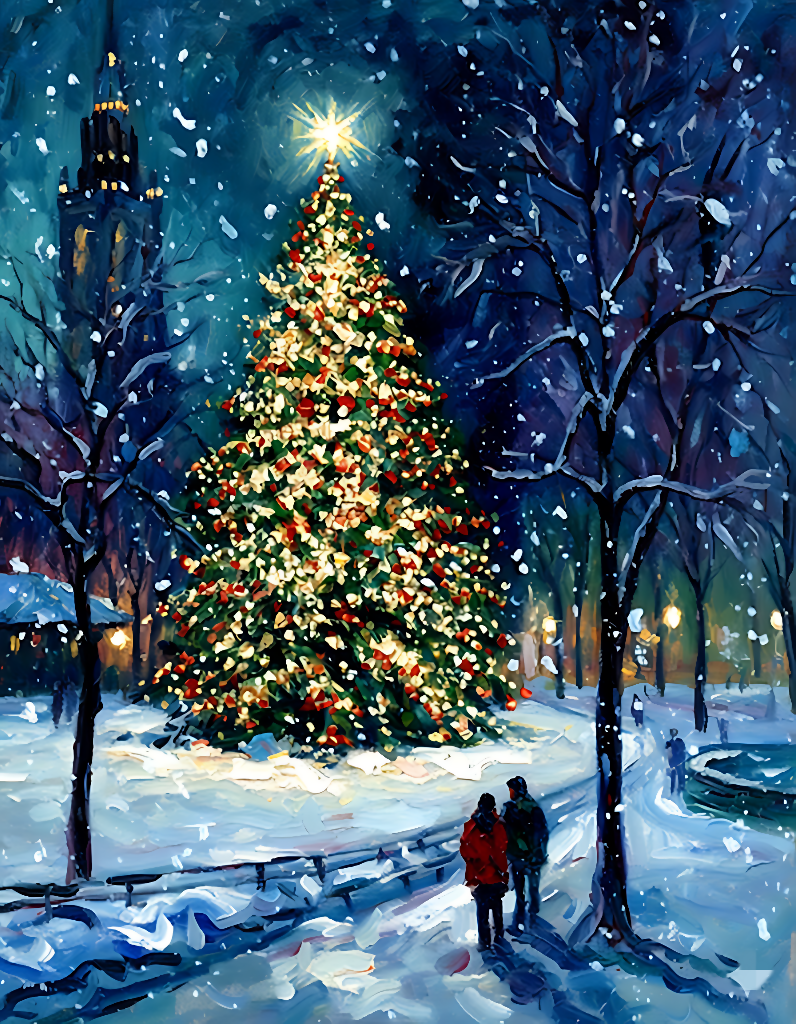 This stunning impressionist winter artwork captures the magic of a snow-covered park at night, illuminated by a beautifully decorated Christmas tree glowing with colorful lights and a radiant star on top. A romantic couple walks hand-in-hand along a snowy path, their silhouettes softly framed by the warm glow of nearby lampposts.