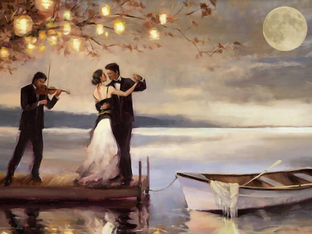 Transform your space into a haven of love and serenity with this breathtaking digital download. Featuring a romantic couple dancing gracefully under a radiant full moon, accompanied by a violinist on a tranquil lakeside pier, this dreamy artwork captures a moment of pure magic. Perfect for romantic home decor, this high-resolution digital painting evokes feelings of nostalgia, elegance, and peace.