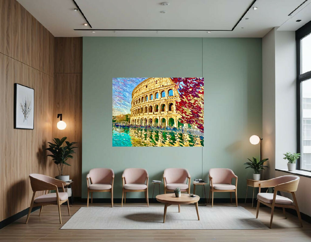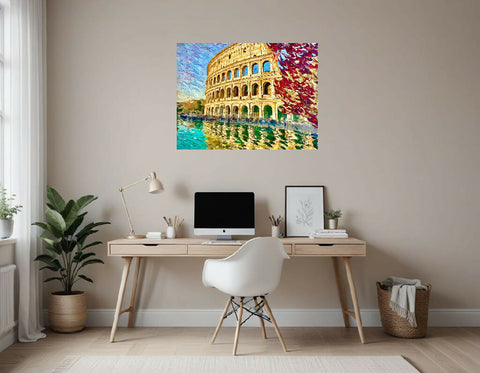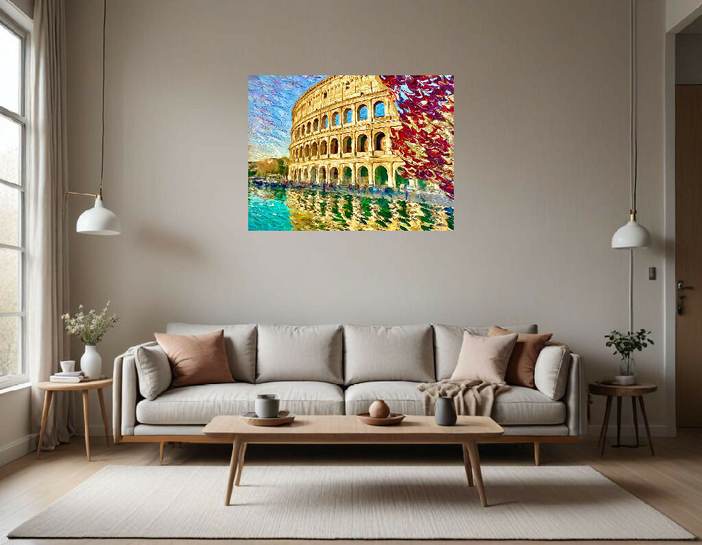 The overall effect is a blend of realism and artistic interpretation, capturing the grandeur of the Colosseum in a unique and visually striking way.
