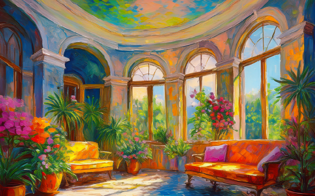 Opulent, well appointed, colorful room with high ceilings, large windows and potted plants and flowers with a couch and love seat in the room.