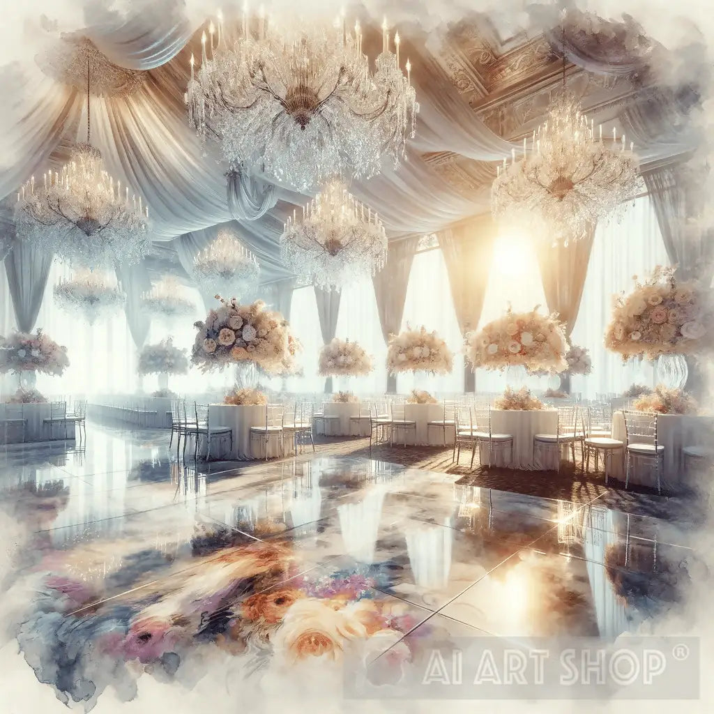 An opulent wedding event space transformed into a dreamy watercolor painting. Large crystal chandeliers blur softly into pastel hues, casting a gentle glow over elegantly decorated tables with floral centerpieces. The reflection of flowers on the polished floor adds a touch of surreal beauty, creating a romantic and ethereal atmosphere.
