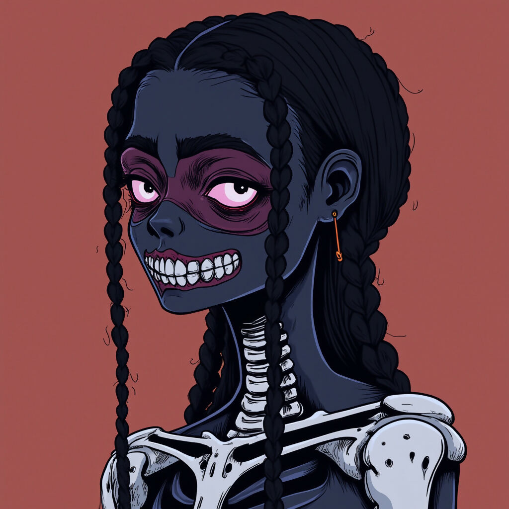 Anime zombie-skeleton humanoid woman with afro, gothic character. Fantasy, soft tones, expressive characters, emotional depth, magical realism, real-world blend, Eastern aesthetics, nostalgic, timeless, classic.