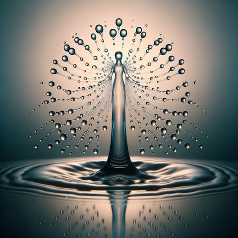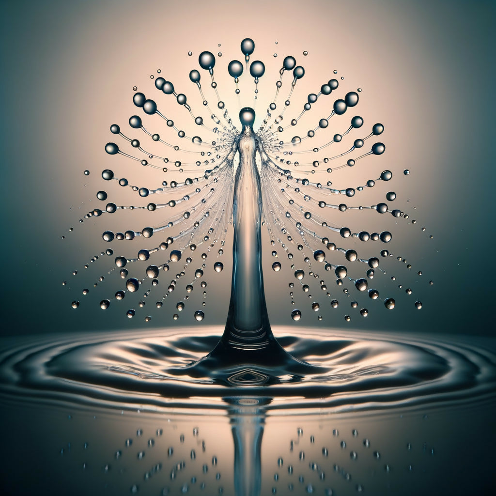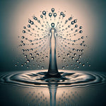 A symmetrical water drop collision creates a crown-like splash with droplets suspended in a serene, gradient background