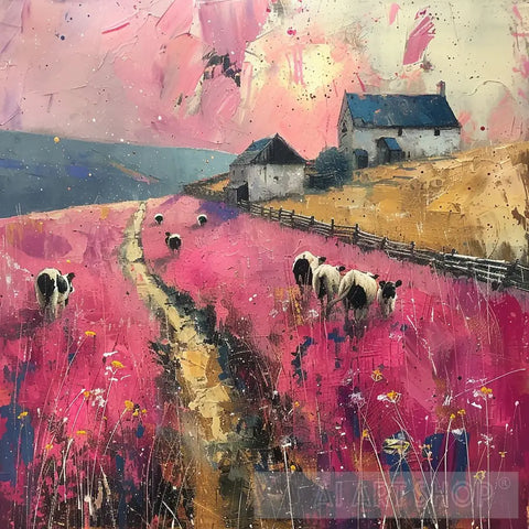Explore the serene essence of a quiet rural farm with barns and grazing animals, rendered in electric blues, hot pinks, and purples. This piece features coarse brushstrokes and multi-layered textures, creating a vibrant and captivating atmosphere.