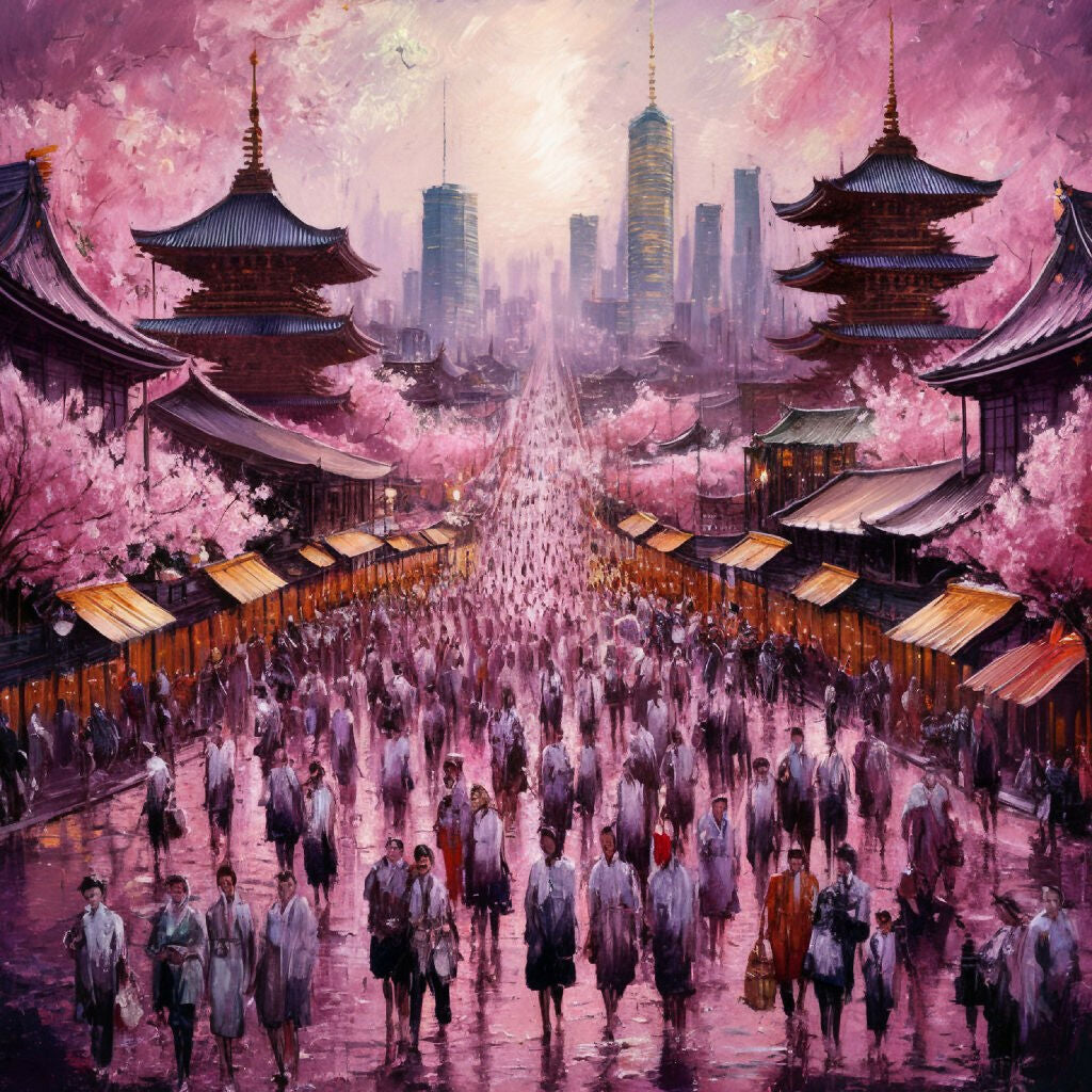 Tokyo's bustling rush hour, with a multitude of people in traditional and modern attire. The cityscape is a vibrant blend of ancient temples and modern skyscrapers, with a backdrop of cherry blossoms in full bloom.