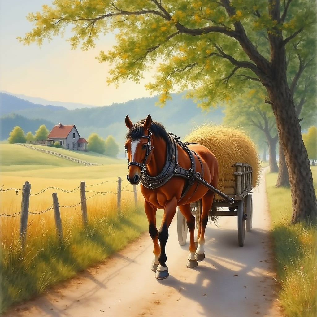 A rustic watercolor painting capturing a timeless countryside scene. A sturdy brown horse with a glossy coat pulls a weathered wooden cart, brimming with golden hay, down a winding, dusty lane. Sunlight filters through the tall trees lining the path, casting dappled shadows on the ground and adding depth to the scene. The air feels warm and still, filled with the scent of earth and hay.