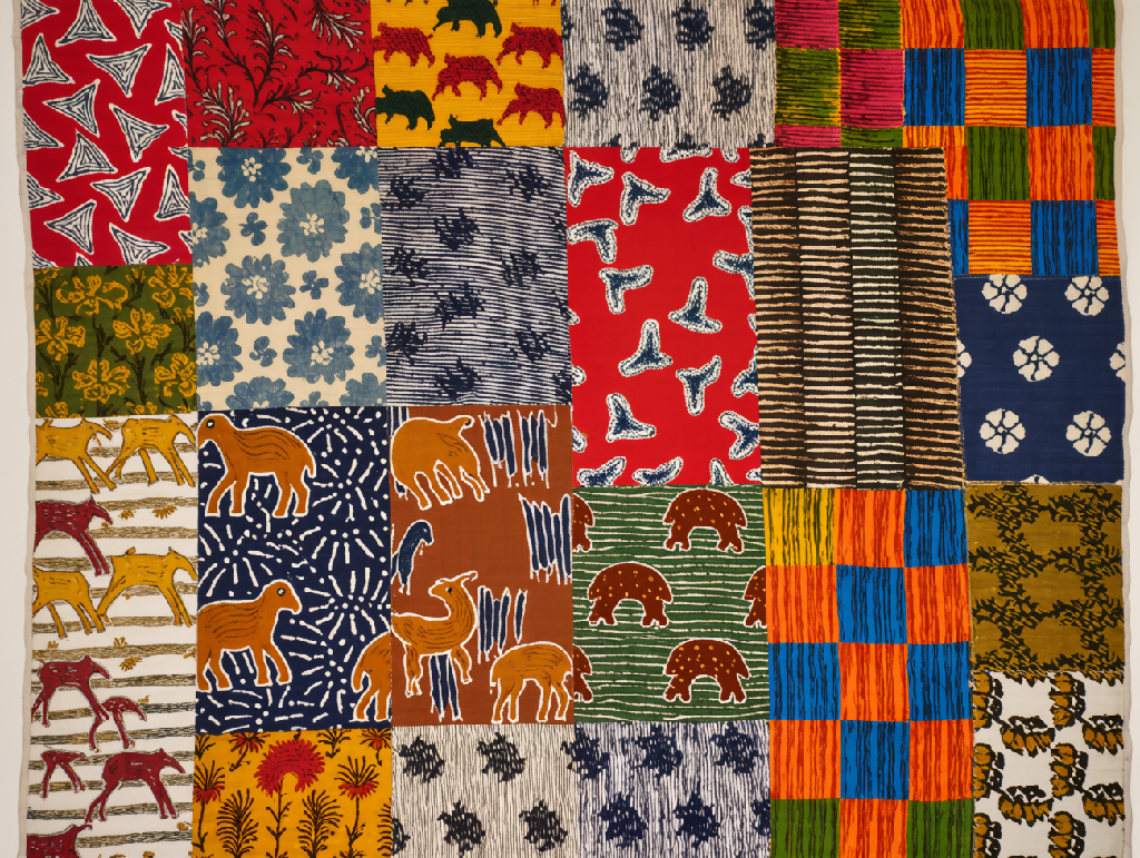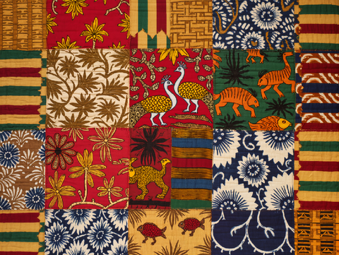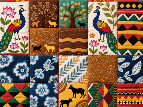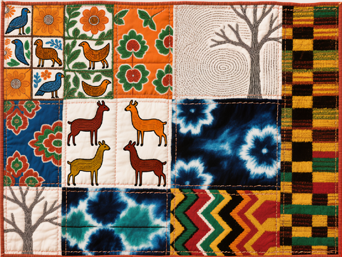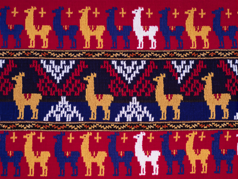 Crimson, gold, and indigo stripes frame stylized alpacas and geometric forms in this richly woven Andean textile, crafted with high-detail precision.
