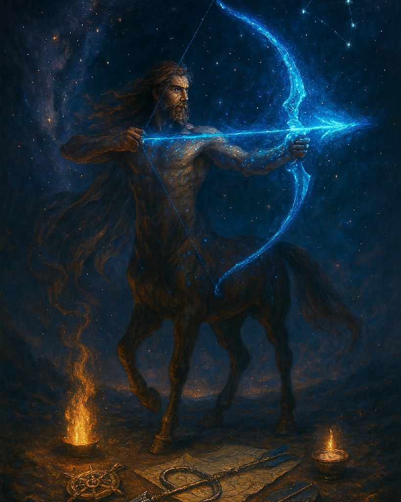 This cosmic centaur stands at the edge of the starlit unknown, drawing back a vibrant, glowing blue bow—his arrow crafted from pure intention and radiant purpose. Around him lie sacred tools: a compass, a burning scroll, celestial maps and a candlelit path. Behind him, the Sagittarius constellation lights the way forward.