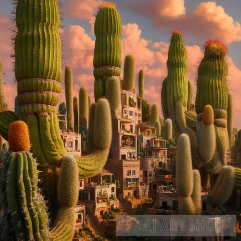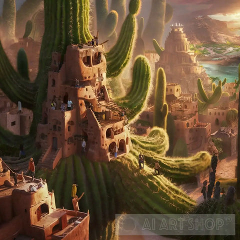 In the heart of the desert, a marvel of human ingenuity thrives. Saguaro Skyrise depicts a bustling city built directly onto the towering arms of giant saguaro cacti. Homes carved into the spiky flesh create a unique and vibrant community bathed in the warm desert sun.