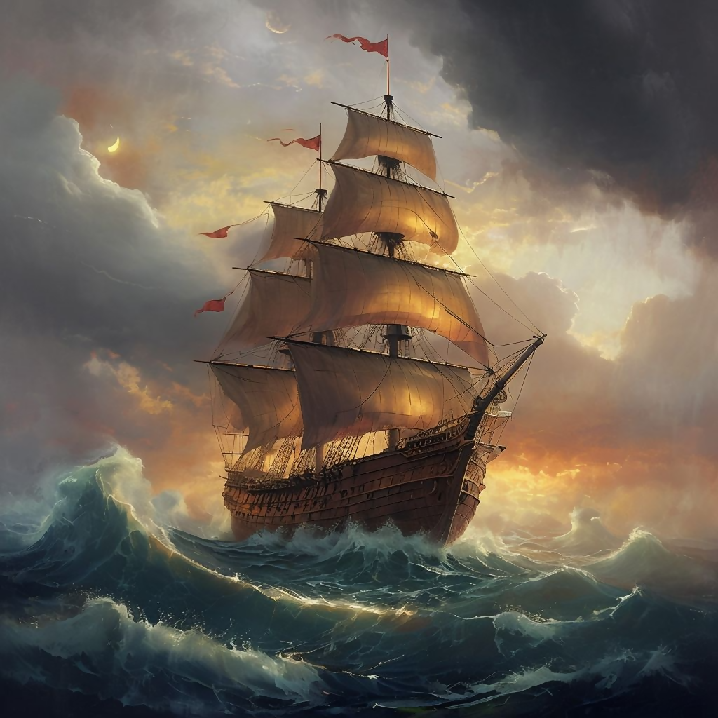 Experience the thrill of adventure with "Sailing in the Storm," a stunning digital artwork that captures the essence of a majestic sailing ship braving tumultuous waves and dark storm clouds. The interplay of golden light piercing through the stormy skies highlights the ship's billowing sails, evoking both the danger and beauty of the open sea. Perfect for nautical enthusiasts and lovers of dramatic seascapes, this artwork brings the spirit of exploration and resilience into your space.