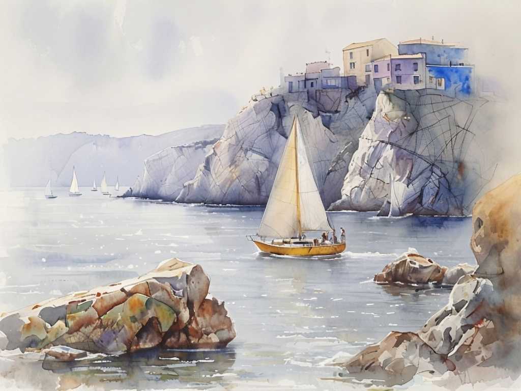 Capture the serene beauty of the coast with this captivating watercolor sailing painting. This exquisite coastal landscape digital art print features a peaceful sailing regatta against a backdrop of charming Mediterranean villages, perfect for nautical wall decor, beach house art, or a unique printable gift. Immerse yourself in the calming waters and scenic cliffs with this high-quality, instant download wall art.
