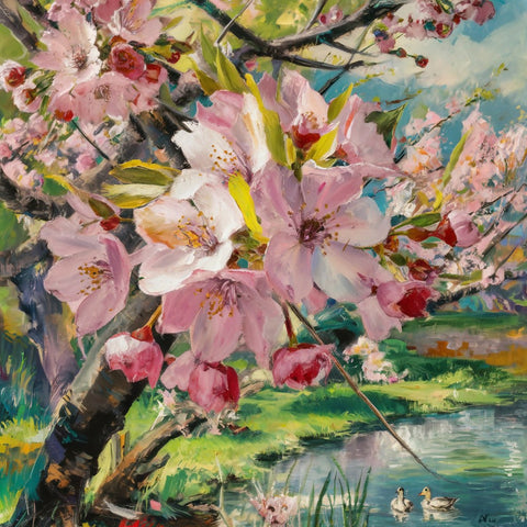 A vivid and abstract Fauvism painting of cherry blossoms in full bloom. The petals are depicted in bright, bold colors with thick, expressive brushstrokes. The background features a whimsical, dreamlike landscape with a serene pond and a few ducks swimming.