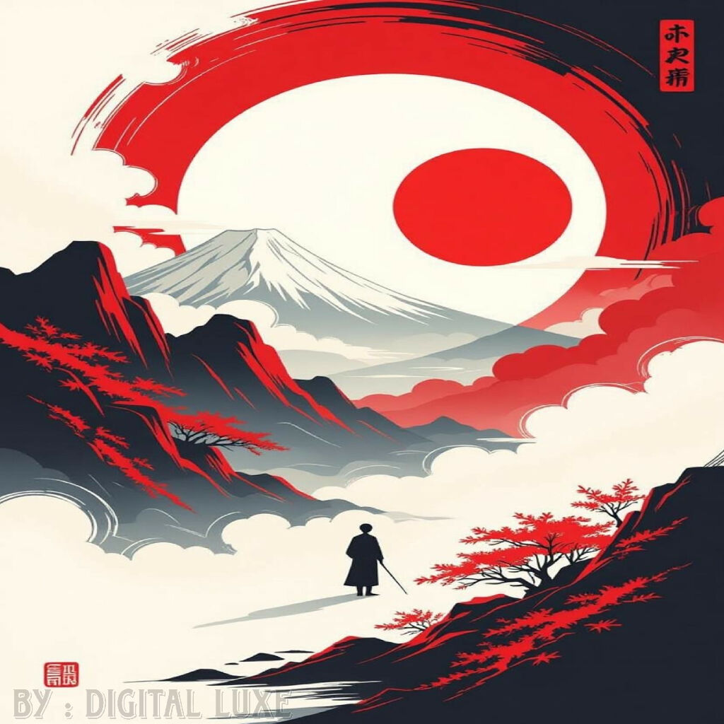 A bold and striking artwork inspired by traditional Japanese aesthetics. Featuring a lone samurai beneath the majestic Mount Fuji and the rising sun, this piece embodies strength, balance, and timeless beauty.