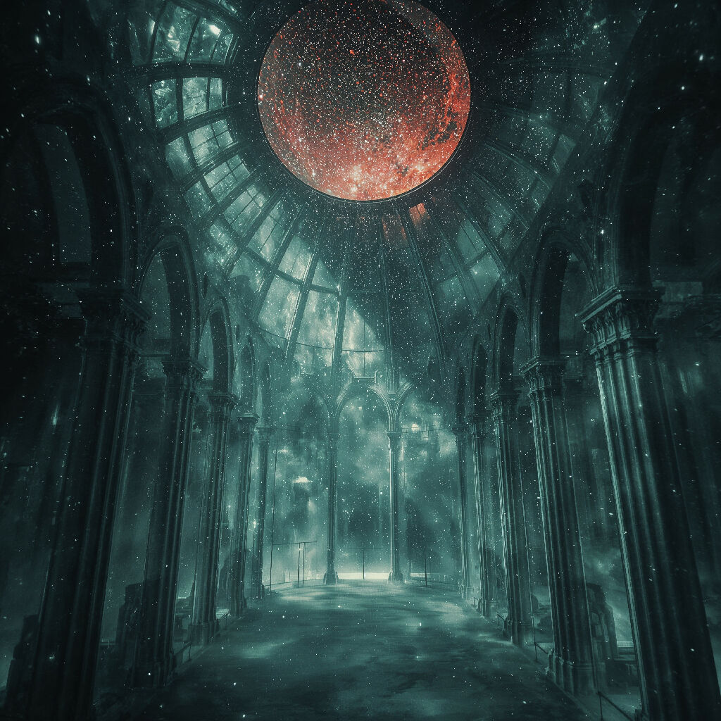 Classical columns frame a crimson celestial body suspended within crystalline transparency. The domed architecture creates sacred geometry, while the contrasting cool and warm palettes suggest temporal and eternal realms intersecting. Starlight filters through glass, transforming the interior into a cosmic observatory where earthly worship meets astronomical wonder. The red sphere commands attention like an otherworldly altar, while surrounding architecture provides human-scaled reverence. This composition explores how sacred spaces can contain infinite mysteries, where architectural permanence houses cosmic impermanence. The interplay of transparency and solidity reflects humanity's desire to make the invisible visible through constructed devotion.