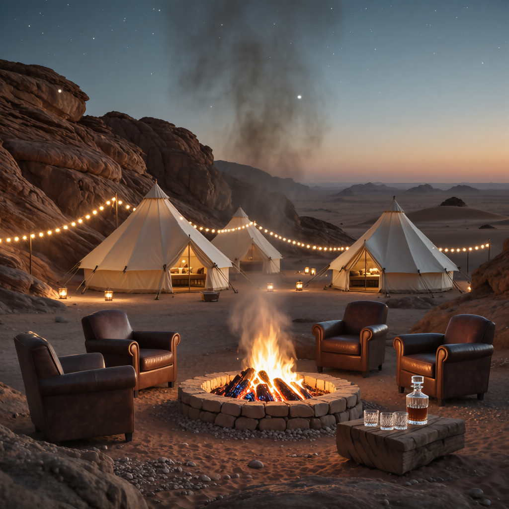 This ultra-detailed desert scene features a cozy fire pit surrounded by leather chairs, whiskey decanters, and string-lit tents nestled in sand dunes. Captured in soft dusk tones, this 8K visual embodies comfort and style amidst the wild.