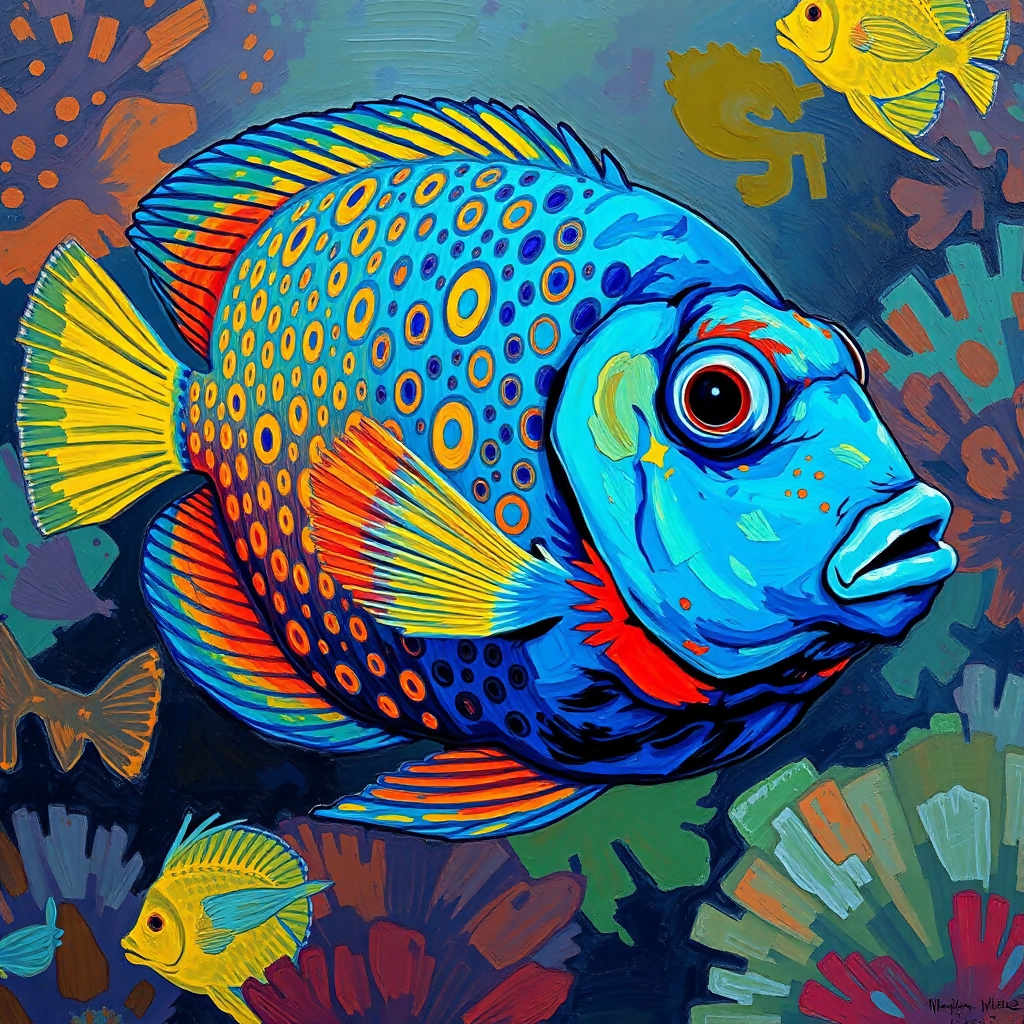 A stunning close-up captures a vibrant blue discus fish gliding through its underwater realm, its body a living canvas of intricate, swirling patterns. The rich cobalt and turquoise hues of its scales shift like liquid silk under the gentle light, while delicate fin rays trail like whispers in the water. Darker, labyrinthine markings adorn its sides, adding an air of mystery to its graceful movement. The soft blur of the aquatic background ensures all focus remains on this regal fish, as if it’s floating in a dreamy, endless blue. Tiny bubbles drift past, enhancing the sense of serenity and depth.