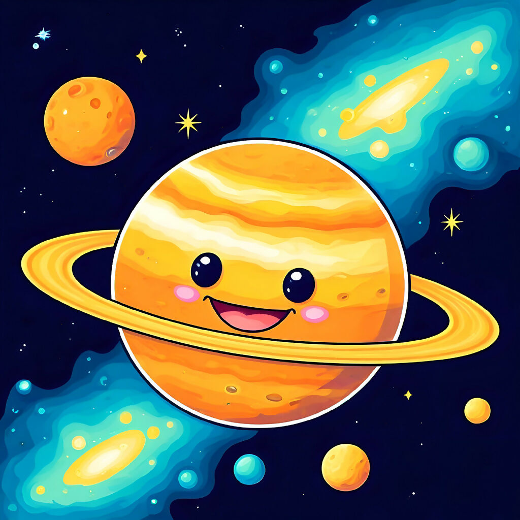Saturn’s Cosmic Joy is a delightful AI-generated space illustration that turns the majestic ringed planet into a cheerful cosmic character! Featuring a smiling Saturn with expressive eyes and vibrant rings, this whimsical artwork brings an imaginative touch to the beauty of the solar system. Set against a mesmerizing galactic backdrop filled with swirling nebulae and distant celestial bodies, this piece exudes cosmic joy and wonder. Perfect for children’s room decor, educational materials, or space enthusiasts who love a lighthearted artistic take on astronomy.