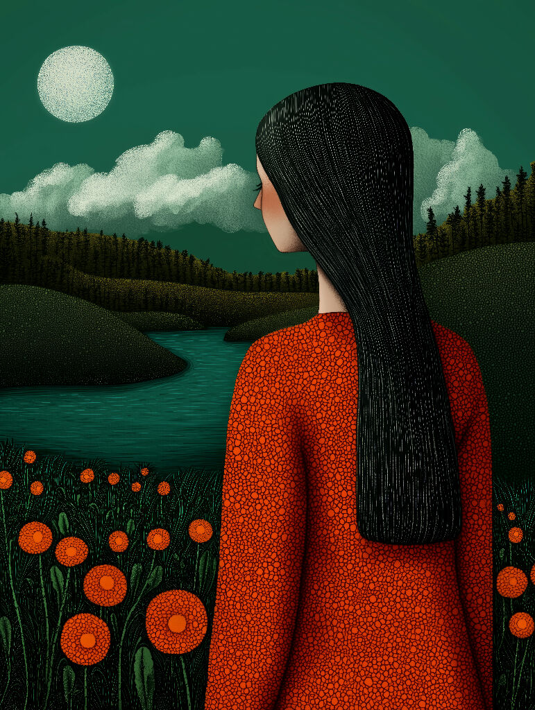 🌿 Scarlet Horizon blends dreamlike landscapes and human presence in a contemplative composition. The vibrant red tones and open space create a sense of stillness and introspection.