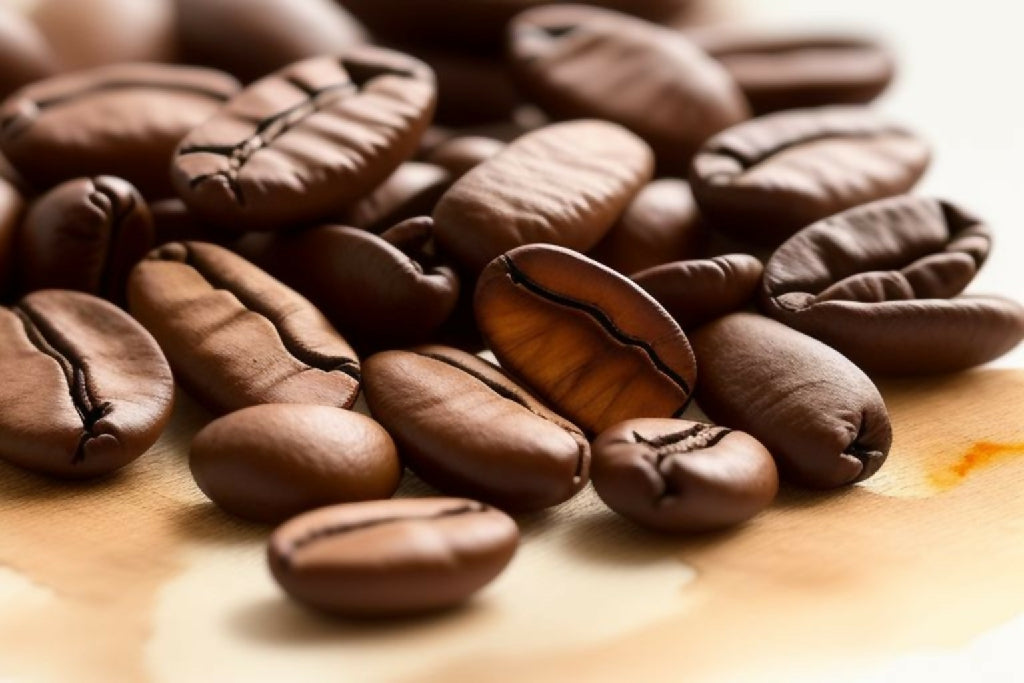 A watercolor drawing of some scattered coffee beans. The coffee beans look fresh and ready to use to make some coffee.