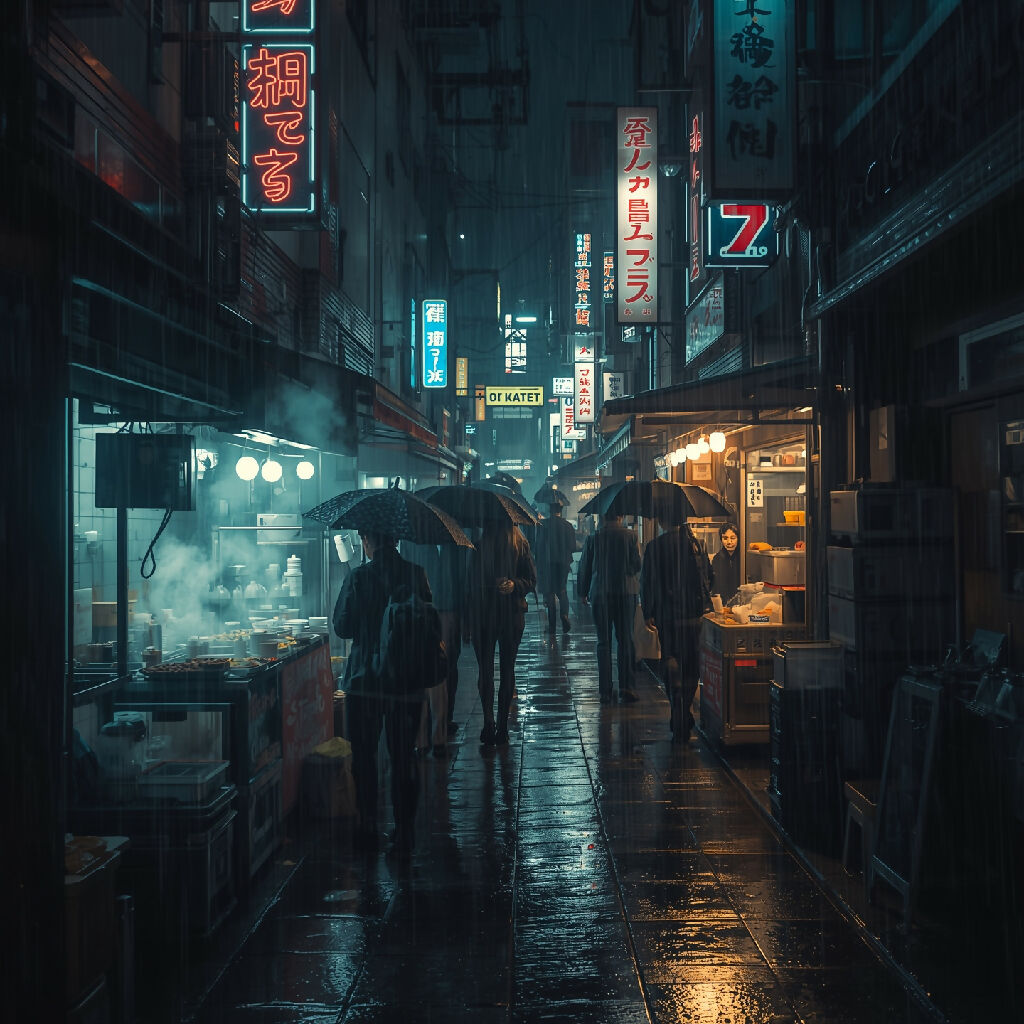 🎬 Scene 2: Street Market Energy Prompt: A rainy Tokyo alley at night