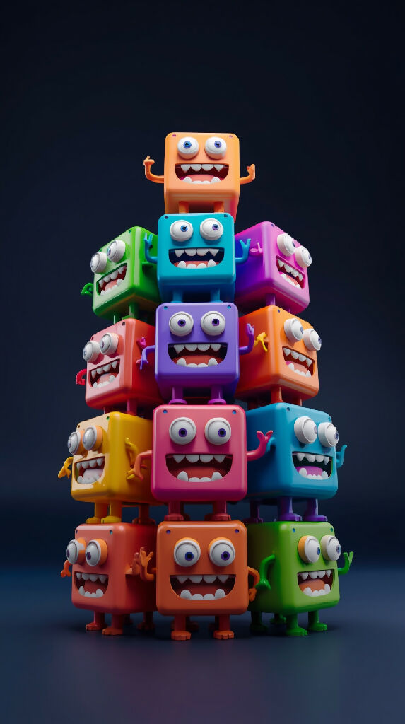 {{ "scene_description": "A colorful stack of 3D cartoonish square and rectangular blocks with monster-like faces, each featuring eyes and teeth, forming a playful arrangement against a dark gradient background.", "characters": [ { "name": "Block Monsters", "age": "N/A", "gender": "N/A", "ethnicity": "N/A", "skin_tone": "various bright solid colors", "hair": { "style": "none", "color": "none" }, "clothing": { "head": "none", "torso": "none", "legs": "none", "feet": "none", "materials": ["smooth plastic-like texture"] }, "pose": "static, stacked in a tower formation", "facial_expression": "wide-eyed, toothy grins or neutral stares", "accessories": ["none"], "held_objects": ["none"], "position_in_scene": "center, stacked vertically and horizontally", "emotions": ["playful", "quirky", "slightly eerie"] } ], "environment": { "setting": "indoor-like digital studio or abstract environment", "background_elements": ["smooth dark gradient background from navy blue to black"], "architectural_features": ["none"], "weather": "none", "lighting": { "type": "artificial", "sources": ["soft studio lighting from top and front"], "shadows": "soft and minimal", "reflections": "yes, slight gloss on surfaces" }, "atmosphere": "clean, digital, toy-like" }, "objects": [ { "name": "Colorful block