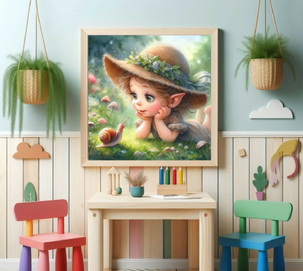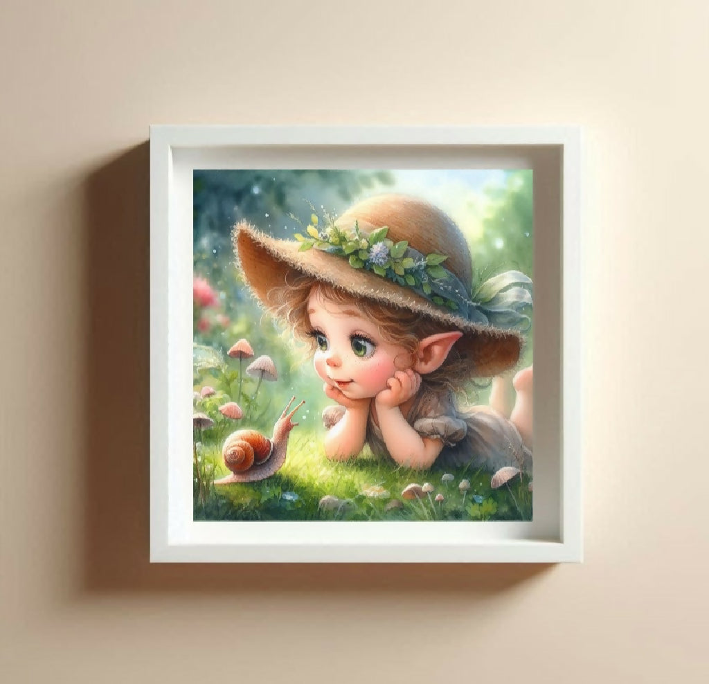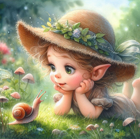 Ein Mädchen liegt auf einer Blumenwiese und betrachtet staunend eine Schnecke.