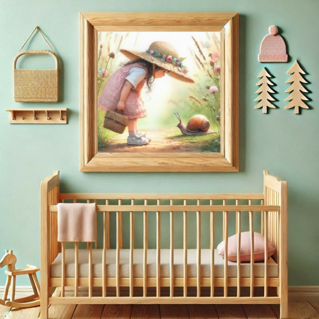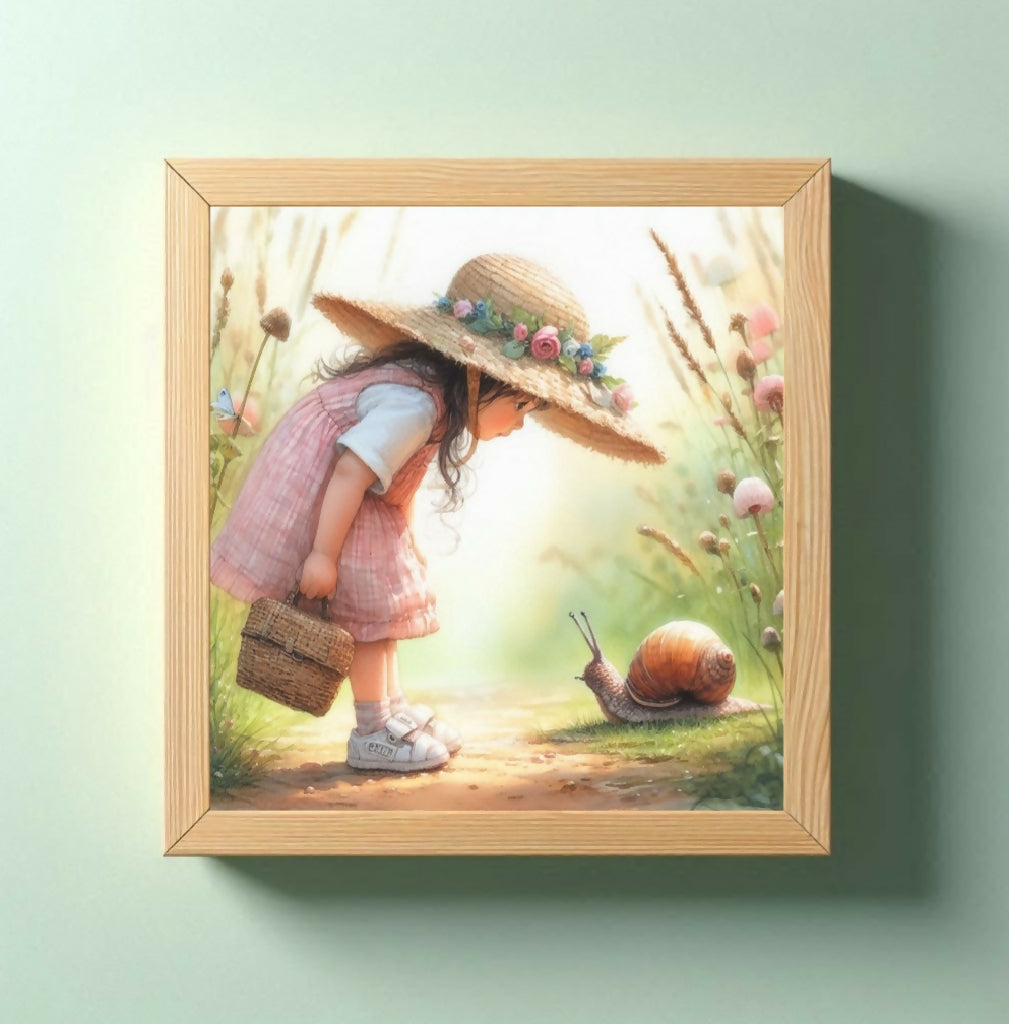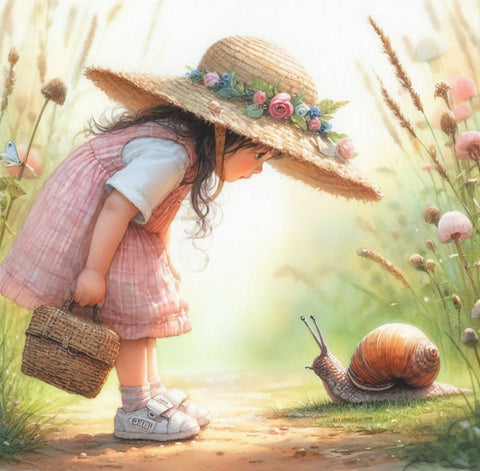 Ein kleines Mädchen beobachtete eine Schnecke, die ihren Weg kreuzt.