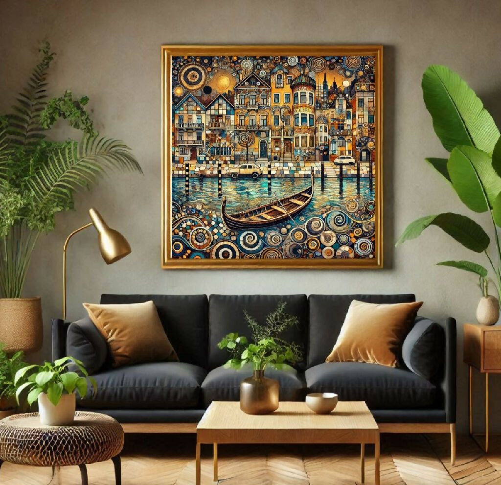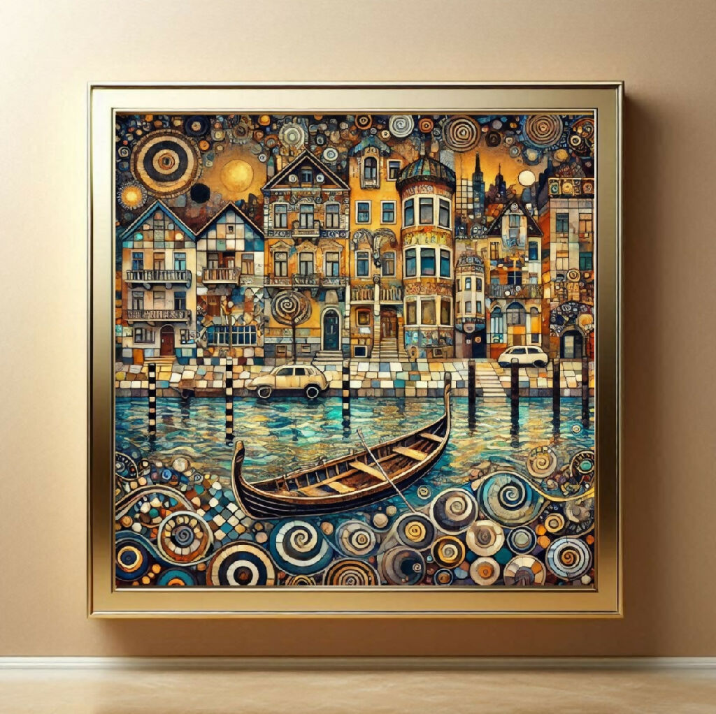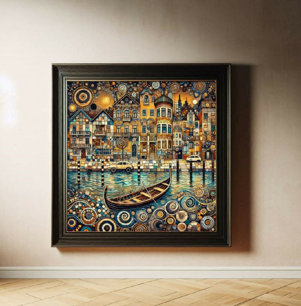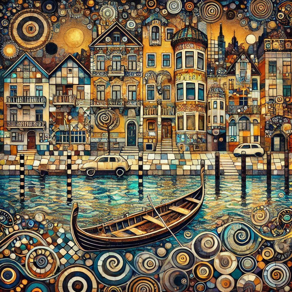 Das ist ein Gemälde einer malerischen, stilisierten Stadtlandschaft, die an eine venezianische oder ähnliche Wasserstadt erinnert. Gebäude in warmen Gelb-, Orange- und Brauntönen stehen eng aneinander und werden von einem Kanal durchzogen, in dem ein traditionelles Ruderboot liegt. Ein Auto und ein weiterer kleiner Wagen stehen am Ufer. Das Wasser und der Vordergrund des Bildes sind mit vielen spiralförmigen Mustern verziert, was dem Werk einen fantasievollen, fast surrealistischen Charakter verleiht. Der Himmel zeigt eine stilisierte Sonne. Das Gesamtbild wirkt detailliert und fantasievoll.