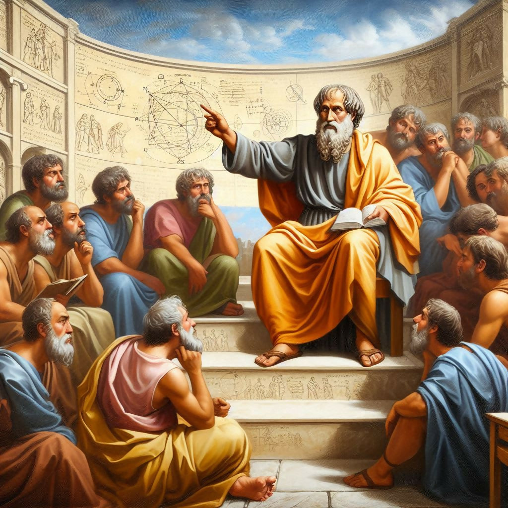 The scientist Aristotle when He explains one of his theories to his students in the third century BC