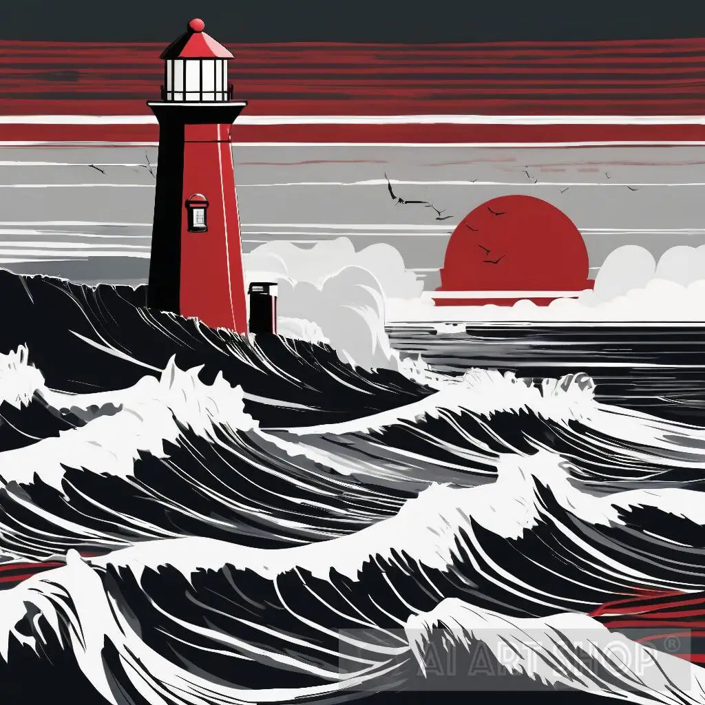 Screaming Sea, Silent Guardian Minimalist: Dramatic Lighthouse Artwork for Coastal Decor
