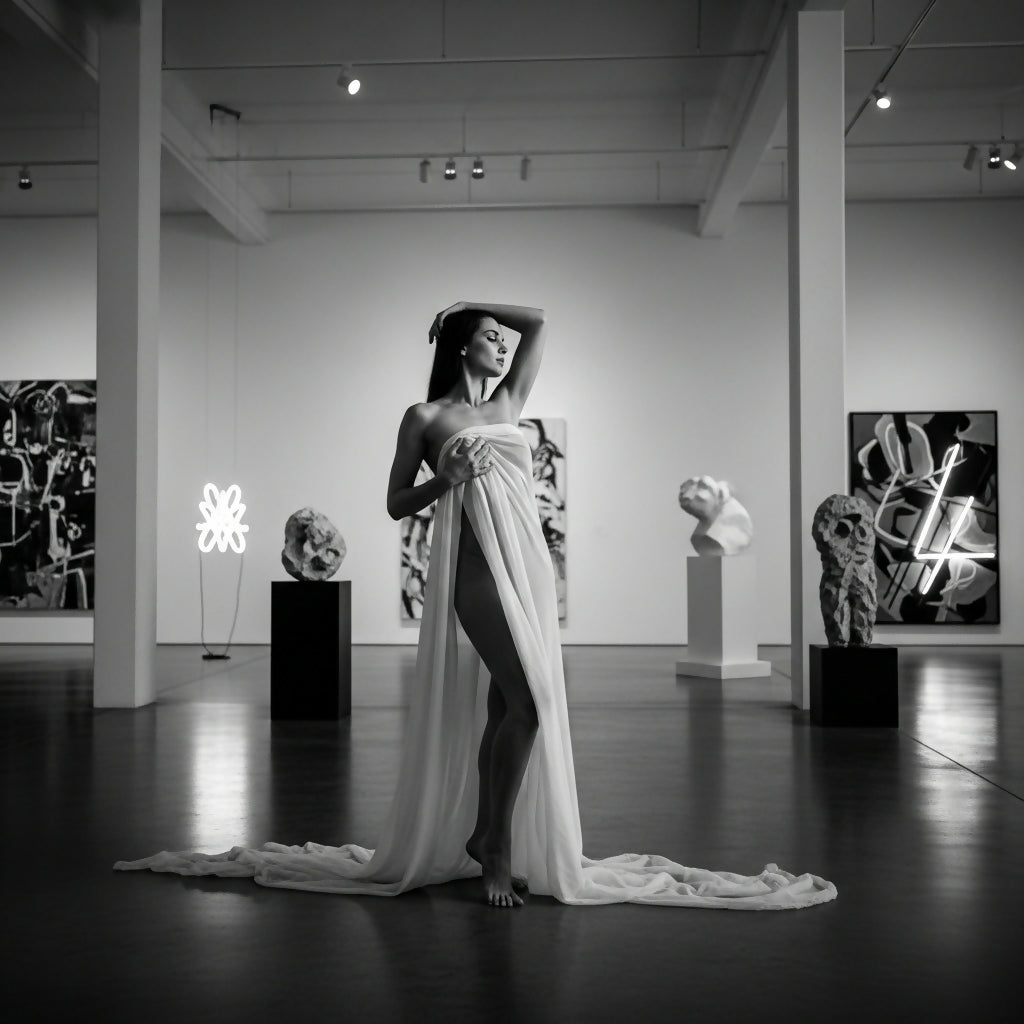 A timeless black and white image captures a figure gracefully draped in fabric, presenting a living sculpture amidst the static art of a modern gallery space, blurring the lines between observer and artwork.