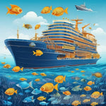 Big ship is sealing through the blue sea and beautiful fishes are around them.