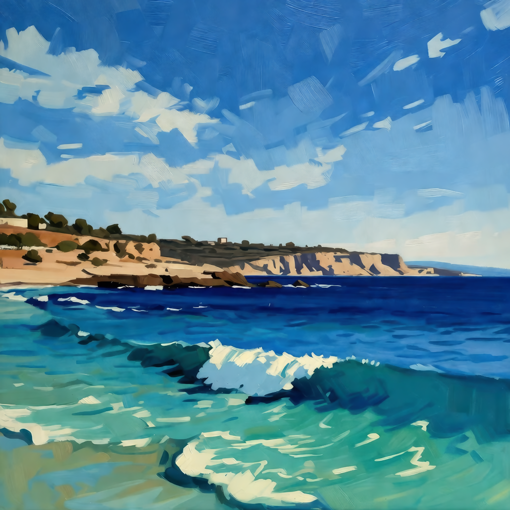 "Sea Surf" is an impressionist painting that captures the fleeting breath of the sea and the play of light. Broad, loose brushstrokes create a sense of the movement of the waves rolling near the shore, reflecting the sky in every shade of blue and turquoise. The cliffs on the horizon are barely hinted at, seemingly dissolving into thin air, emphasizing the essential element—the vibrant, changing state of nature. The painting is filled with freshness, light, and the calm energy of the sea, evoking a sense of spaciousness and inner peace.