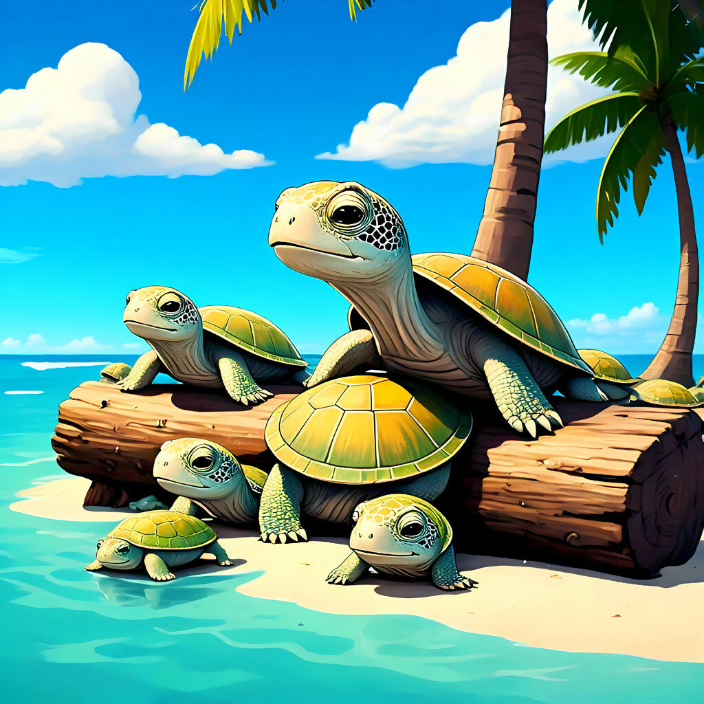 Bask in the tranquil beauty of Sea Turtle Serenity on Tropical Shore, a vibrant AI-generated artwork capturing six sea turtles resting peacefully on a sunlit beach. Nestled around a weathered log beneath swaying palm trees, these majestic creatures—ranging from wise elders to curious hatchlings—embody the rhythm of coastal life. The turquoise ocean whispers nearby, and the golden sand glows under a bright blue sky. This scene tells a story of harmony, resilience, and the timeless bond between land and sea. Ideal for nature lovers and wildlife enthusiasts, this piece evokes a sense of calm and connection with the natural world.