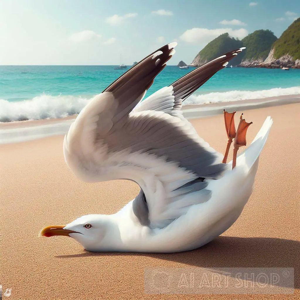 Seagull Practicing Matless Yoga on the Beach Sand